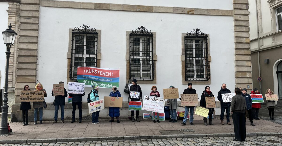 Wer in der Demokratie schläft, wacht in der Diktatur auf. Deshalb engagieren wir uns als „Aufstehen! Esslinger Initiative für Demokratie“ für den Erhalt und die Stärkung unserer Demokratie. Die größte Gefahr sehen wir in der völkisch-nationalistischen Politik der AfD mit Leuten wie Björn Höcke in führender Position, der vom Verfassungsschutz (VS) als Rechtsextremist eingestuft wird. Der VS beobachtet übrigens auch die Landes-AfD.