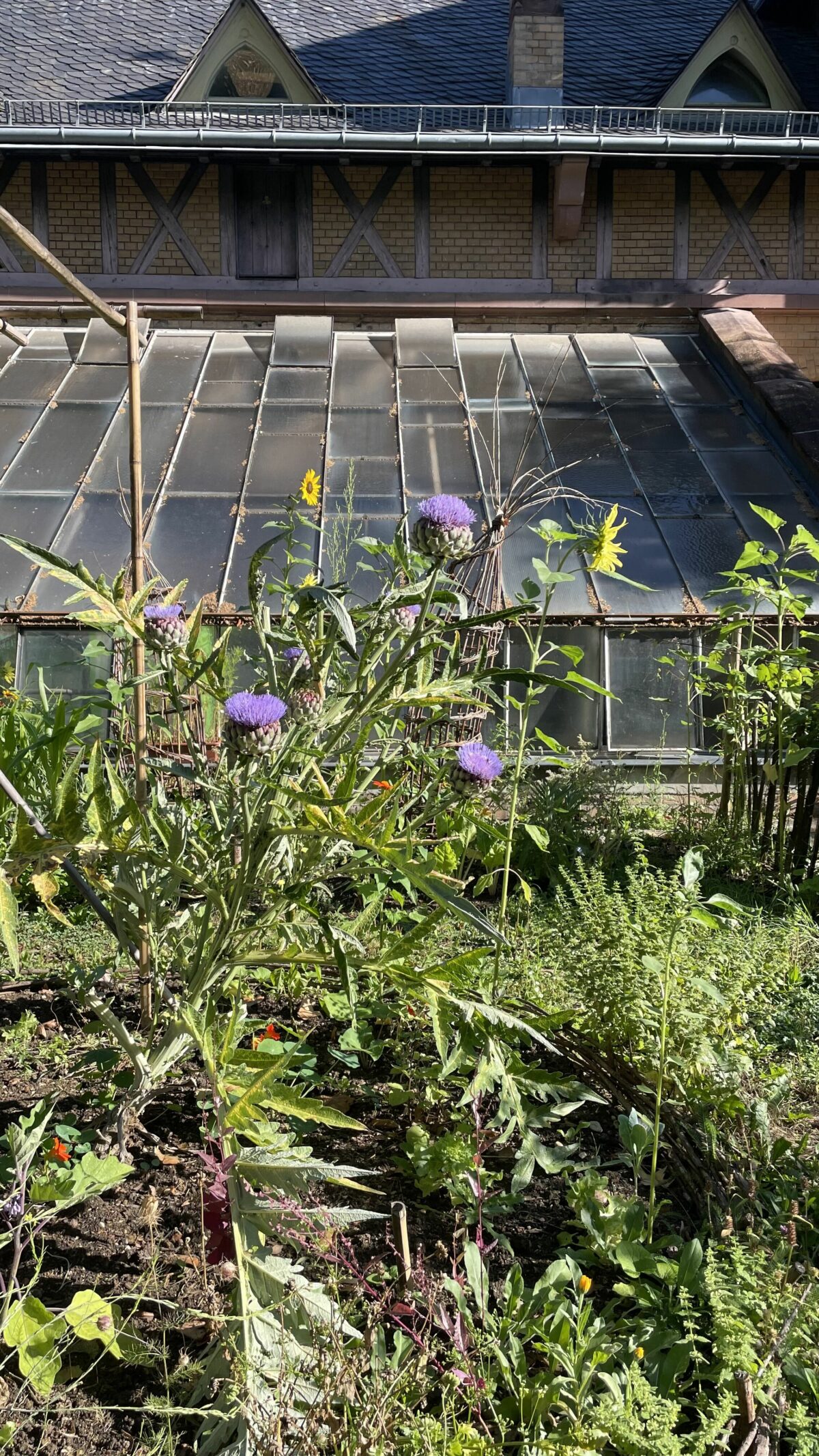 Die Sonnenblumen und Blüten der Feuerbohnen leuchten noch im Gemeinschaftsgarten vor dem Gärtnerhaus, doch auch hier zieht so langsam der Herbst ein. Die letzten warmen Sommerabende haben wir noch genutzt, um gemeinsam draußen zu essen und uns an der Schönheit zu erfreuen, die wir über das Jahr geschaffen und gepflegt haben. Wir blicken bereits auf die vierte Gartensaison zurück und doch wird es uns nicht langweilig: Immer wieder neue Menschen haben ihre Ideen mitgebracht, neue Gemüsesorten wurden ausprobiert – bestimmt habt ihr unsere Artischocke gesehen und bei genauerem hinsehen vielleicht auch schwarze Tomaten und schlangenförmige Auberginen. Dieses Jahr waren wir mit unseren Workshops (Ikebana und Pflanzenfarbe) sogar in der Innenstadt und durften das ehemalige Kögel-Areal mit aktivieren. Ab Oktober begibt sich die Gartengruppe der Villa Merkel in den Winterschlaf, um dann im März 2026 wieder neu zu starten. Wir bedanken uns bei allen, die uns unterstützt haben, für einen Plausch vorbeigekommen sind und mit uns den Stadtacker genossen haben.