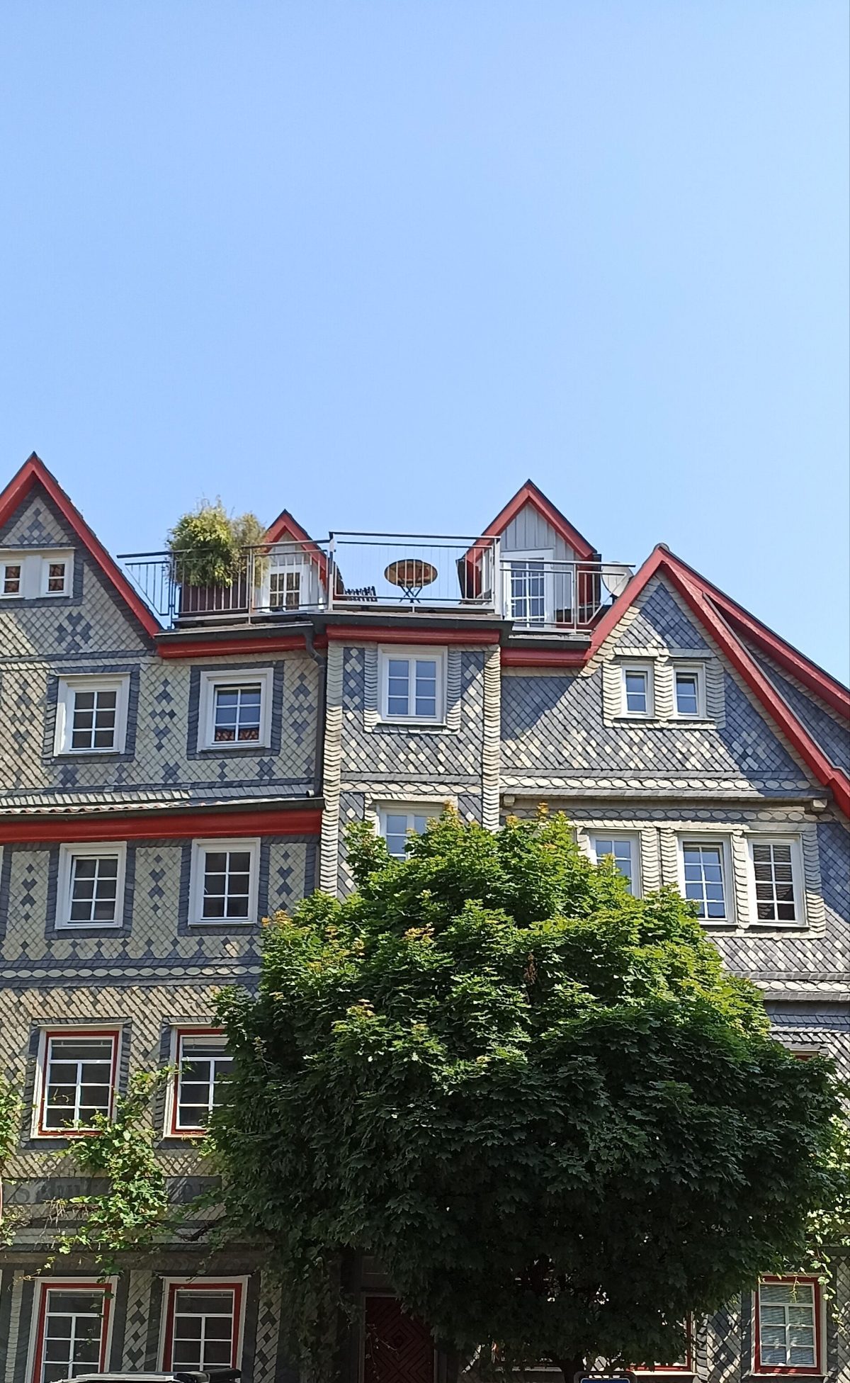 Foto: Elke Paul Bei meinem Morgenlauf durch die Straßen Esslingens bleibe ich begeistert steh’n.um auf das Dach dieses interessanten Hauses zu seh’nAn diesem Tischchen über den Bäumen,mit einem Kaffee sich in den Tag hineinträumen.so könnte mein Tag beginnenIn unserem schönen ESSLINGEN