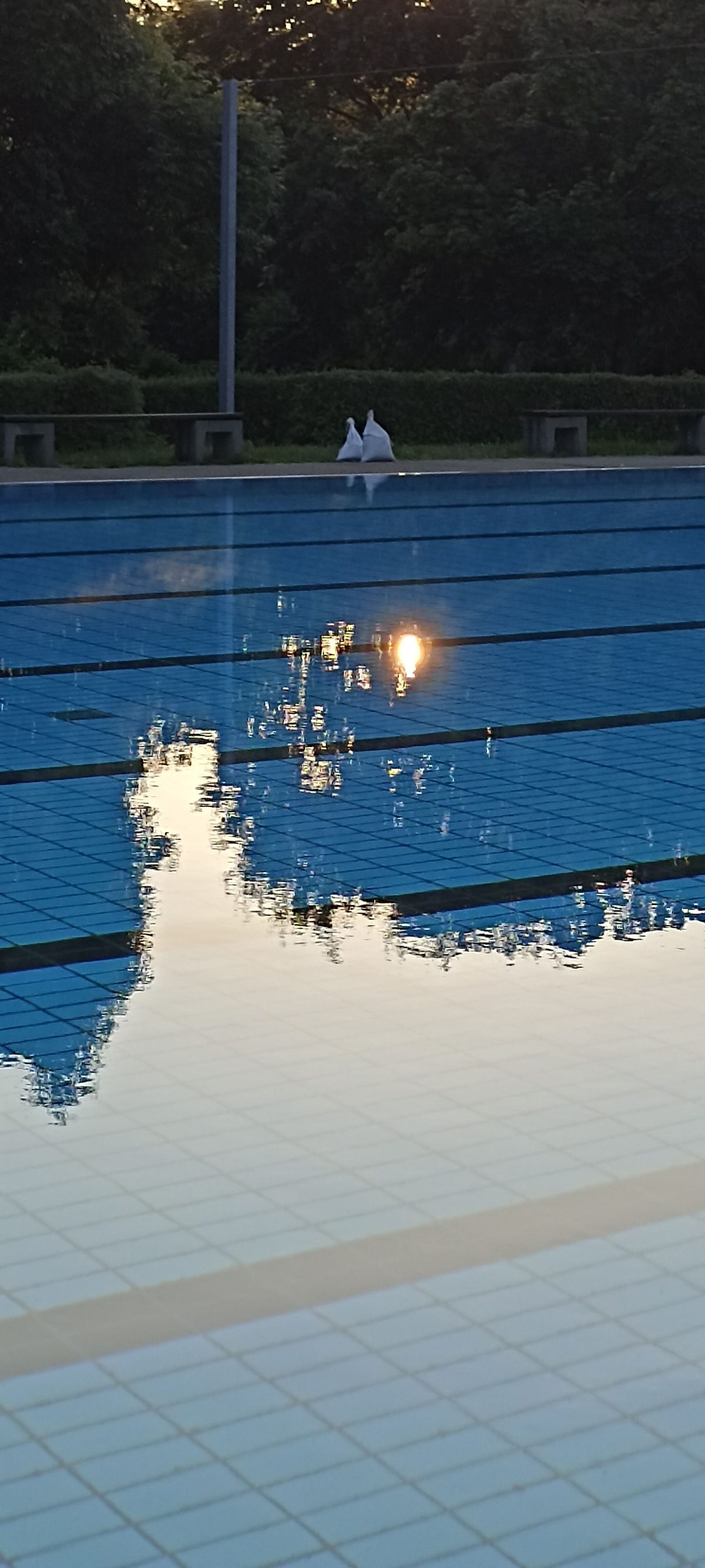 Foto: Elke Paul Möchte man die ersten Sonnenstrahlen im Wasser sehen,muß man sehr früh aufstehen.Der SSV macht es möglich in den Tag hinein zu schwimmenso kann der Tag mit viel Elan beginnen.