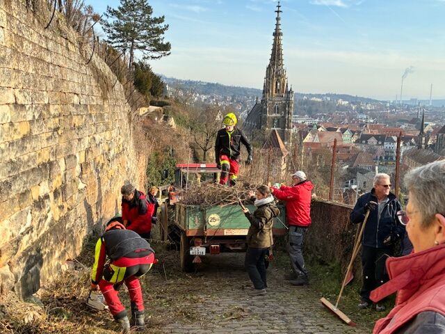 Am Samstag, den 17. Januar 2026, engagierten sich 25 Helferinnen und Helfer des Staffelsteiger-Vereins sowie Unterstützende bei der diesjährigen Putzete des Esslinger Weinerlebniswegs in den terrassierten Steillagen. Nach einer kurzen Stärkung und fachlichen Einweisung machten sich die Teilnehmenden, ausgestattet mit Freischneidern, Sägen, Gabeln und Besen, motiviert an die Arbeit.