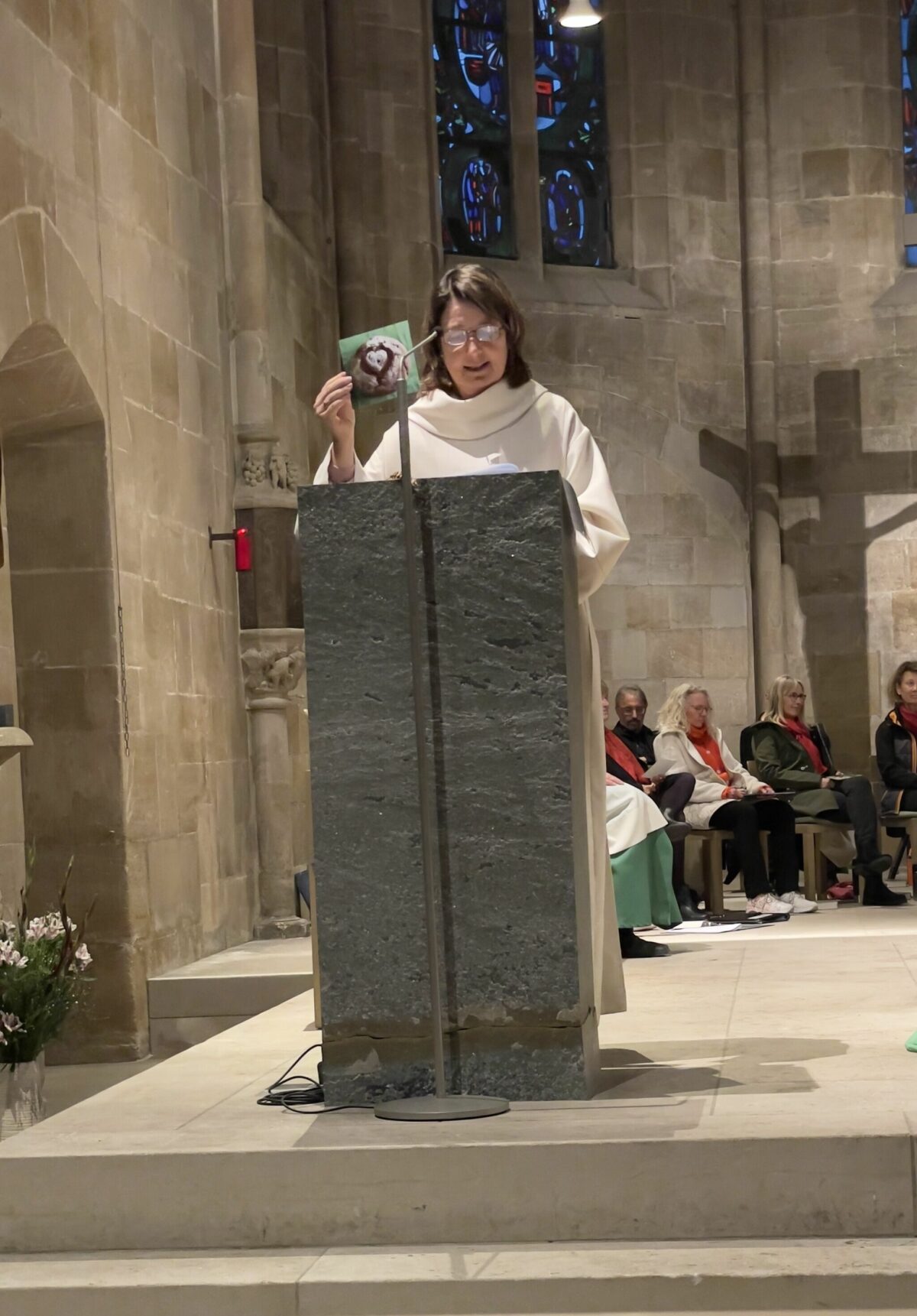 Am Erntedanksonntag fand wieder der beliebte Gottesdienst für Hochzeitsjubilare im Münster St. Paul statt. Viele Paare waren der Einladung gefolgt, um ihre Beziehung unter den Segen Gottes zu stellen. Der Gottesdienst wurde gestaltet von Pfarrer Stefan Möhler und Andrea Weber, Referentin für Partnerschaft und Familie im Dekanat Esslingen-Nürtingen. „Bunt wie die Gaben am Altar mit hellen und dunklen Farben ist das Miteinander in der Partnerschaft“ – so Andrea Weber in ihrer Begrüßung. Was sind unsere Kraftquellen? Was stärkt unser Herz in unserer Partnerschaft? Die anschließende Bildbetrachtung zum „Herzbrot“ und seinen Zutaten lieferte dazu Gedankenanstöße: die Ähre mit ihren Körnern als Symbol für Gemeinsamkeit, das Salz für Würze und das richtige Maß von Nähe und Distanz, schließlich die Gärungsprozesse der Hefe für Ruhe und Wachstum. In der anschließenden Meditation galt es den Blick zurück wie auch nach vorn zu richten, sich zu erinnern an erfüllte Gemeinsamkeit und auch den Träumen Raum geben. Bei allen menschlichen Bemühungen um gelingende Partnerschaft aber bleibt die Erfahrung der Grenzen und der Zerbrechlichkeit der Liebe. „Tiefere Kraft und Energie gibt die größere Liebe, die uns umschließt“ – so Andrea Weber (Joh 6,32-35.) Im Anschluss an den Gottesdienst waren alle eingeladen, sich für ihren gemeinsamen Weg und ihre Liebe persönlich Gottes Segen zusprechen zu lassen. Der Gottesdienst wurde musikalisch umrahmt vom Chor Chorazon unter der Leitung von Johanne Zelle mit der Popmesse von Michael Schmoll und mitreißenden Liedern – ein herzliches Dankeschön allen Beteiligten für eine inspirierende Feier.