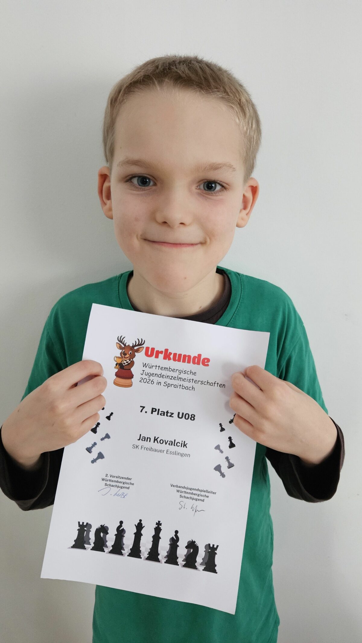 Vom 28.2.-1.3. wurde die württembergische Meisterschaft in der U8 in Spraitbach ausgetragen. Insgesamt maßen sich die besten 22 Schachkinder aus Württemberg in einem 7rundigen Turnier. Vom SK Freibauer durfte Jan Kovalcik beim Turnier starten. Er konnte starke 4 Punkte erzielen, was den 7. Platz bedeutete. Auf württembergischer Ebene ein Ergebnis, auf das er stolz sein darf.