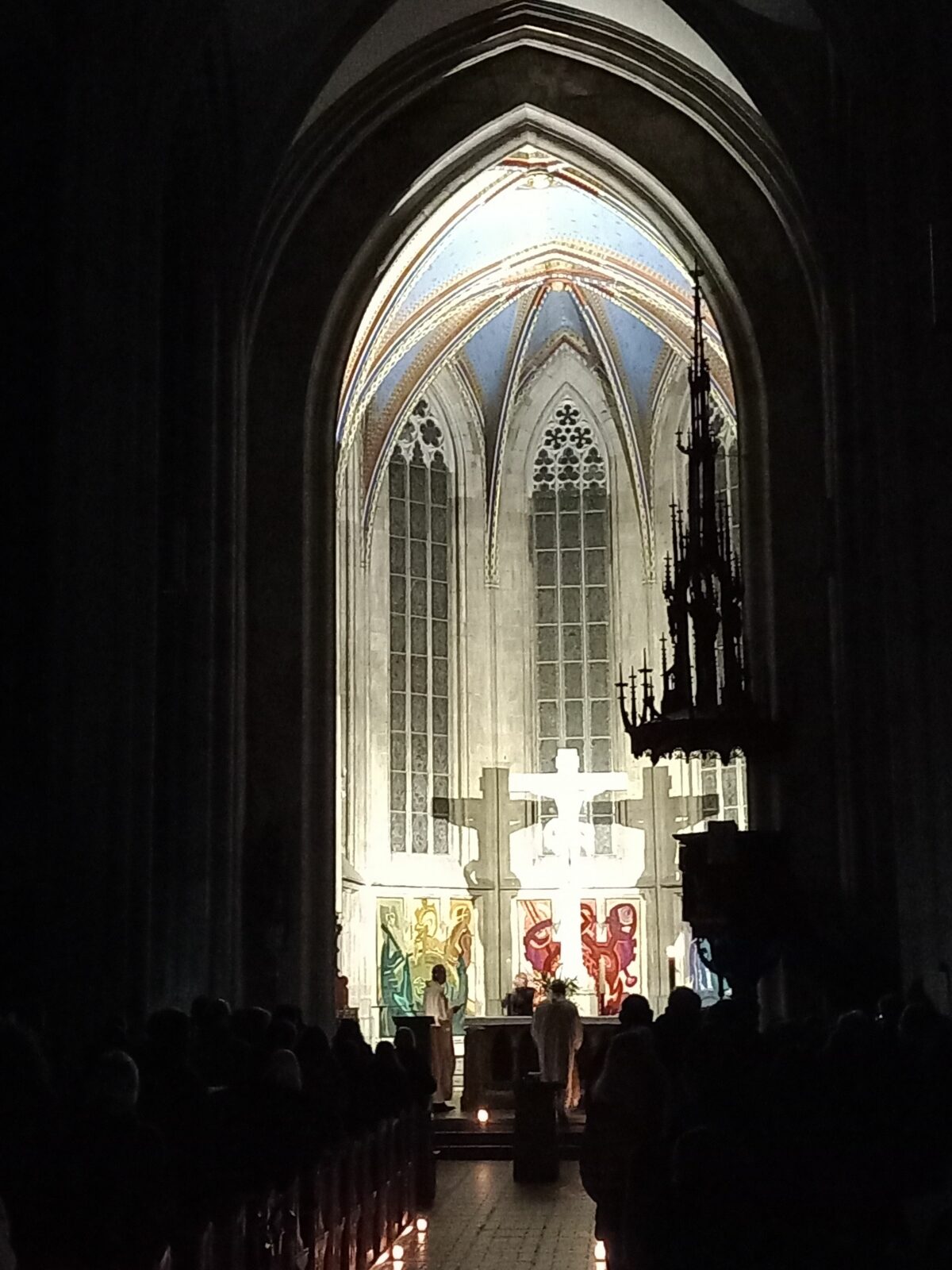 Die Erwachsenen versammeln sich um 10 Uhr zum Kreuzweg in St. Katharina und um 15 Uhr dann zur Karfreitagsliturgie im Münster St. Paul – am Abend um 19.30 Uhr umrahmt die Scola Gregoriana die Karmette. Traditionell brennt hier ein Lichterbogen mit 14 Kerzen – nach jedem Psalm oder jeder Lesung wird 1 Kerze auf dem Bogen gelöscht. Bereits um 17 Uhr findet dann die Karliturgie mit Chor und Instrumentalisten in St. Maria in Mettingen statt.