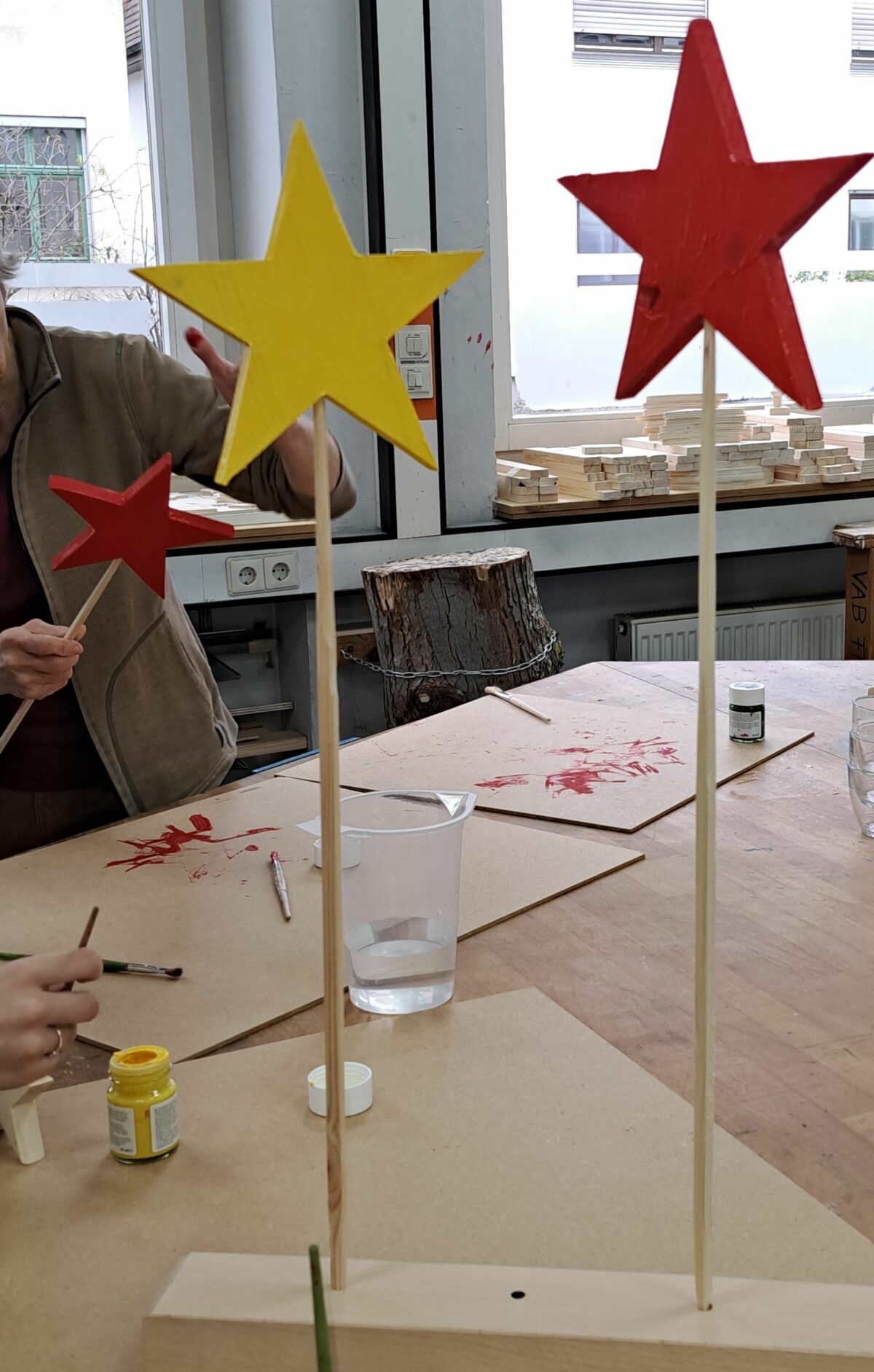 Die Schüler*innen hatten die Möglichkeit Praxisluft im BAZ Esslingen zu schnuppern. Dabei lernten sie verschiedene Berufsfelder kennen, erhielten Einblicke in die erforderlichen Fähigkeiten und probierten die Tätigkeiten selbst aus. In diesem Jahr standen die Berufsfelder Holz und Gestaltung, Küche und Hauswirtschaft sowie der Verkauf auf dem Programm. So wurden Holzsterne angefertigt und Weihnachtsplätzchen gebacken. Für den Verkauf der selbst hergestellten Produkte entwarfen die Schüler*innen Verkaufsplakate, die sie dann zur Vermarktung der Waren verwendeten.
