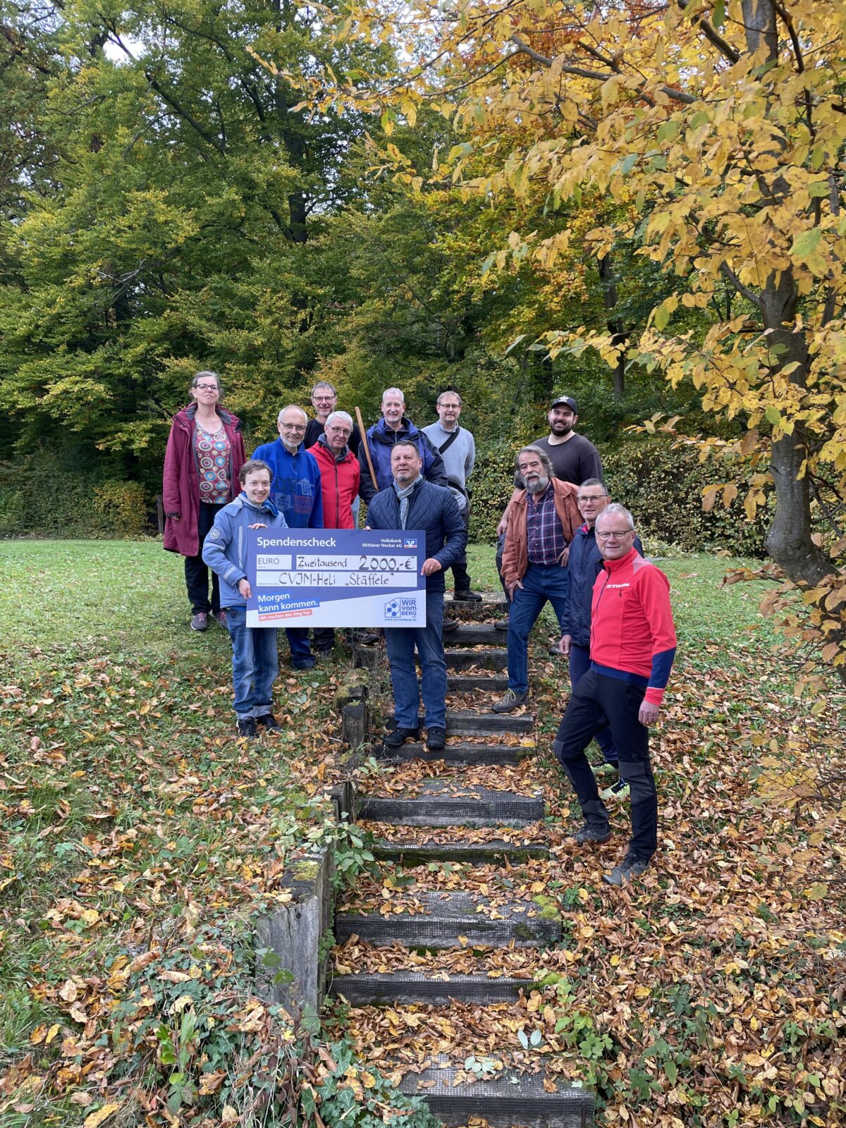 Der Förderverein Wir vom Berg e.V. darf den CVJM Hegensberg-Liebersbronn e.V. bei der Sanierung der Treppe am Jungscharhäusle mit einer Spende über 2000,-€ helfen. Dazu kam ein Teil des Wir vom Berg Vorstands zum Herbstarbeitseinsatz des CVJM und überreichte den Mitgliedern einen symbolischen Spendenscheck.