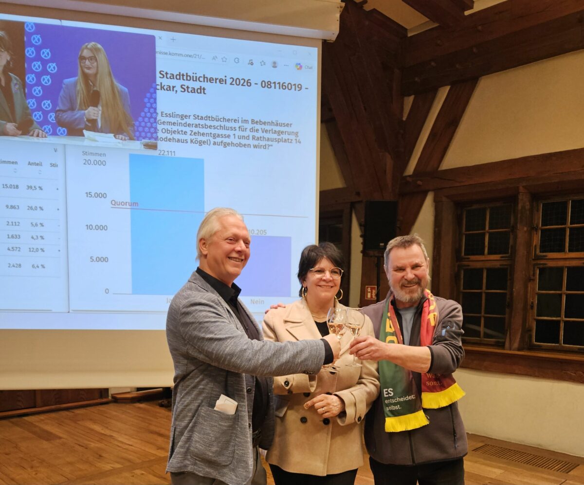 Verlassen von seinen Mitstreitern konnte sich der OB am Wahlabend leider nicht zu einer Gratulation durchringen, das ist kein guter politischer Stil! Dennoch erwarten wir, dass die Stadt dieses klare Votum zeitnah umsetzt. Die jahrelange Diskussion um den Standort der Stadtbücherei ist beendet! Jetzt geht es auch darum, die entstandenen Gräben in der Stadt zu überwinden mit dem Ziel einer modernen Stadtbücherei im Pfleghof – offen und attraktiv für alle Nutzergruppen.
