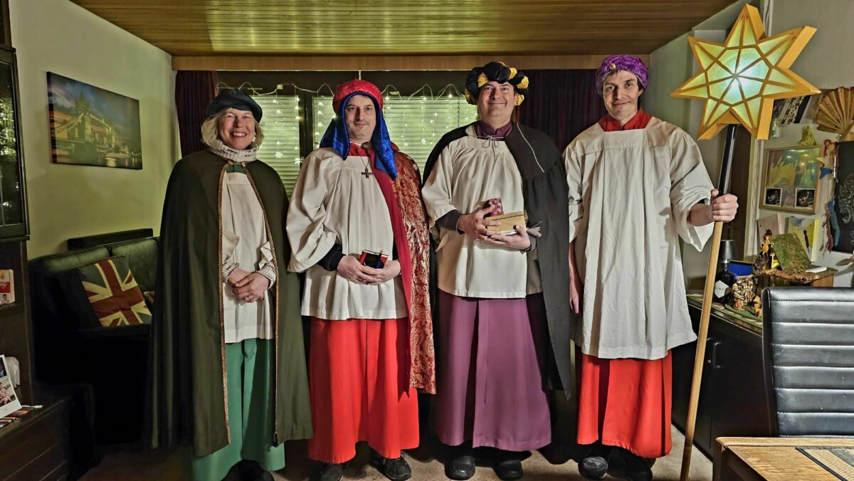 Wenn Sterndeuter einem Stern folgen und ihre Kamele mit den Füßen scharren – dann nahen sie – die Sternsinger. Kaspar, Melchior, Balthasar und ihr Stern. Singen Lieder und sagen ihre Sprüche auf. Zum Schluss schreiben sie mit geweihter Kreide den Segen “christus mansionem benedicat – Christus segne diese/s Wohnung/Haus” an die Türen.