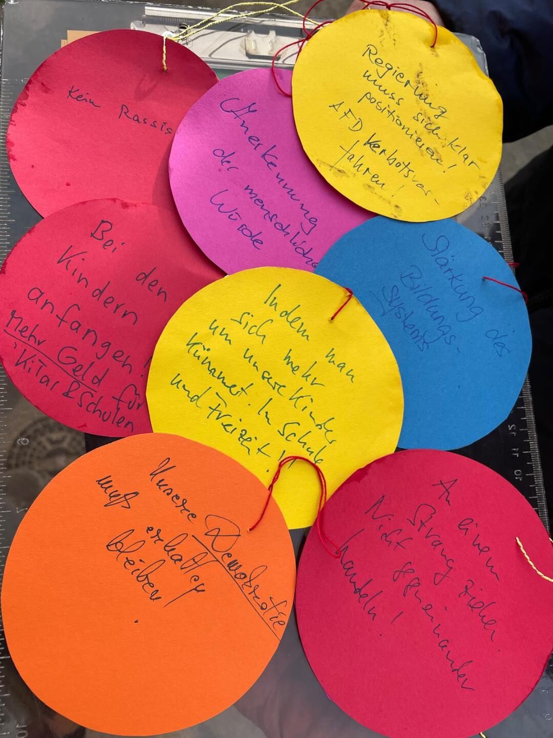 miteinander“, „Solidarität!“, „frühkindliche Bildung“, „Demokratieverständnis schon an Schulen!“, „Zusammen Mitte bilden!“