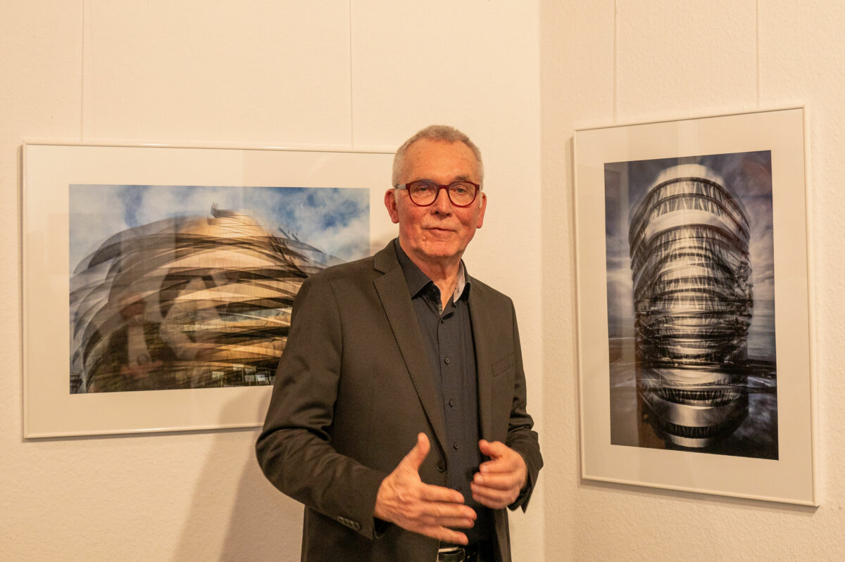 Ursula Stampfer, Architektin und Fotografin der Lichtbildnergruppe stimmte inhaltlich ein. Sie führte aus, wie Uwe Keller durch Mehrfachbelichtungen Bilder konstruiert und dabei Motive verfremdet. Während er bei der Aufnahme den Raum durchschreitet, ändern sich Perspektiven, die fotografisch festgehalten und dann am Rechner verfeinert werden.
