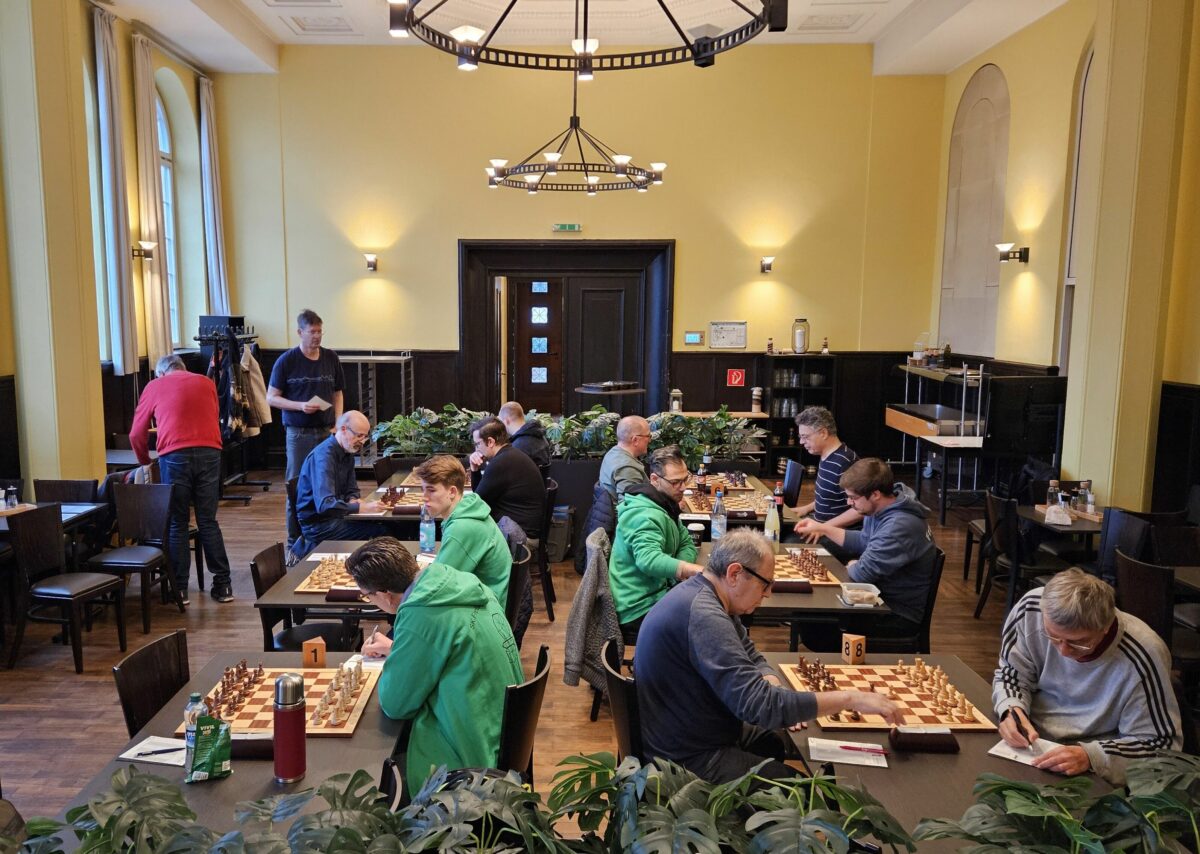 Dass man in Runde 4 der Kreisklasse daheim im Stadtderby “nicht hoch gewinnen” würde, war angesichts der Überlegenheit des Freibauern 2 absehbar – doch die 2:6-Niederlage schmerzte. Am 6. Brett profitierte Matthias Giese von einem inkorrekten Qualitätsopfer des Gegners, doch behielt dieser die Initiative, um in ein gefährliches Endspiel zu kommen. So nahm Giese das Remisangebot lieber an. Fuchs an 1 lieferte eine miserable Vorstellung ab: die fahrige Eröffnungsphase hinterließ eine ramponierte Bauernstruktur und unkoordinierte Figuren, welche noch in einen Läuferspieß taumelten … Gerd von Olnhausen (8) entschied sich in gedrückter Stellung für ein Qualitätsopfer als Befreiungsschlag, was der Gegner aber parierte. Nur verrechnete sich dieser an der Schwelle zum Endspiel, so dass von Olnhausen mit einem Mehrbauern ins Turmendspiel gehen und einen Punkt holen konnte. Guntram Doleschal (2) stand lange ausgeglichen und stellungssymmetrisch – doch lief er zum Schluss in einen nicht mehr zu verteidigenden Doppelangriff auf die Grundreihe. Sören Hader (3) verlor einen eingekreisten Läufer und erlebte schließlich die volle Härte eines konzertierten Schwer- und Leichtfigurenangriffs. Ohne Zeitnotschlacht kam diesmal Ronald Hahnke (5) aus. Eine ausgeglichene Stellung legte den Kontrahenten eine Punkteteilung nahe, die forcierten Abtausche standen kurz bevor. Am 7. Brett hatte Stefan Handl die Qualität gewonnen, doch gelang seinem Gegenüber ein Bauernsturm auf die Rochadestellung. Zuletzt Robert Schulz (4): geschlossene Stellung, eingekeilte Figuren beiderseits, doch der “Freibauer”-Spieler, strategisch überlegen, zerdrückte die Rochadestellung mit seiner Schwerfigurendrucksäule.